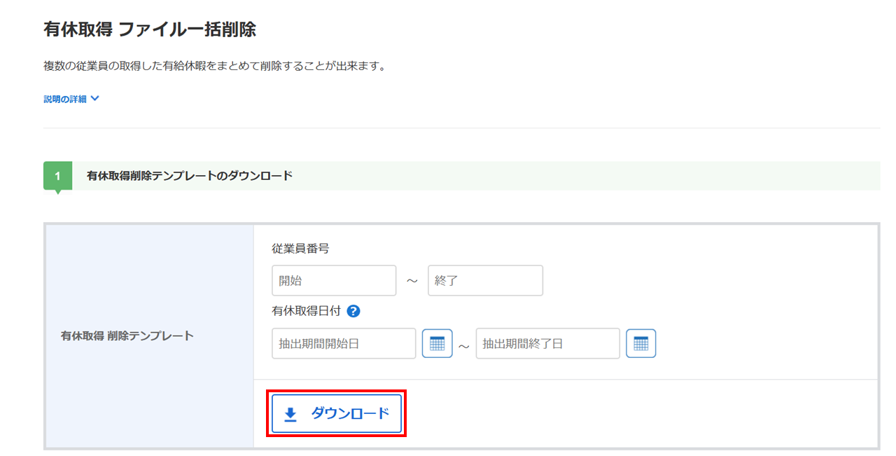 一度に処理できるデータ件数は、5,000件までです。5,000件を超える場合は、従業員番号の「開始」「終了」、有休取得日付の「抽出期間開始日」「抽出期間終了日」を設定し、複数回に分けてダウンロードをおこなってください。