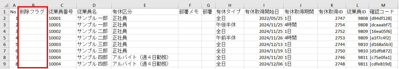 ダウンロードした削除テンプレートを開き、削除する有休取得情報の「削除フラグ」列に「1」を入力し、上書き保存します。