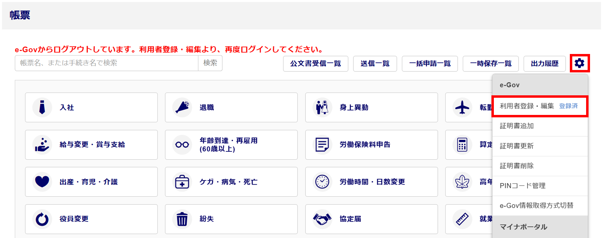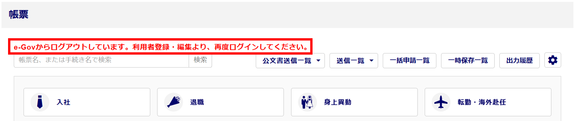 e-Govの最終利用日から180日経過したり、e-Govとの接続が遮断されてしまった場合に、「e-Govからログアウトしています。利用者登録・編集より、再度ログインしてください。」とメッセージが表示されます。