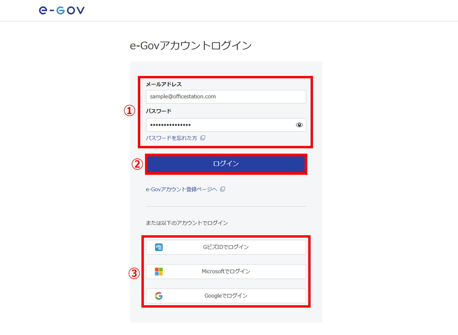 「GビズID」などでログインしている場合は、「または以下のアカウントでログイン」(③)から操作します。