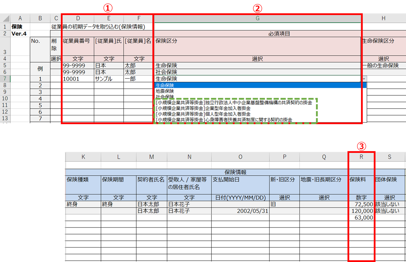 | ② | G列 | 保険区分 | 確定拠出型年金の保険区分を選択します。 ・[小規模企業共済等掛金]独立行政法人中小企業基盤整備機構の共済契約の 掛金 ・[小規模企業共済等掛金]企業型年金加入者掛金 ・[小規模企業共済等掛金]個人型年金加入者掛金 ・[小規模企業共済等掛金]心身障害者扶養共済制度に関する契約の掛金 |