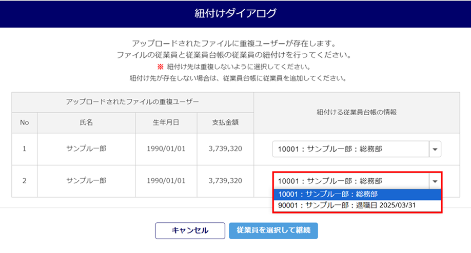 法定調書CSVファイル内に「氏」「名」「生年月日」が重複する従業員情報が存在している場合、「紐付けダイアログ」画面が表示されます。紐付け先の従業員台帳情報を選択してください。