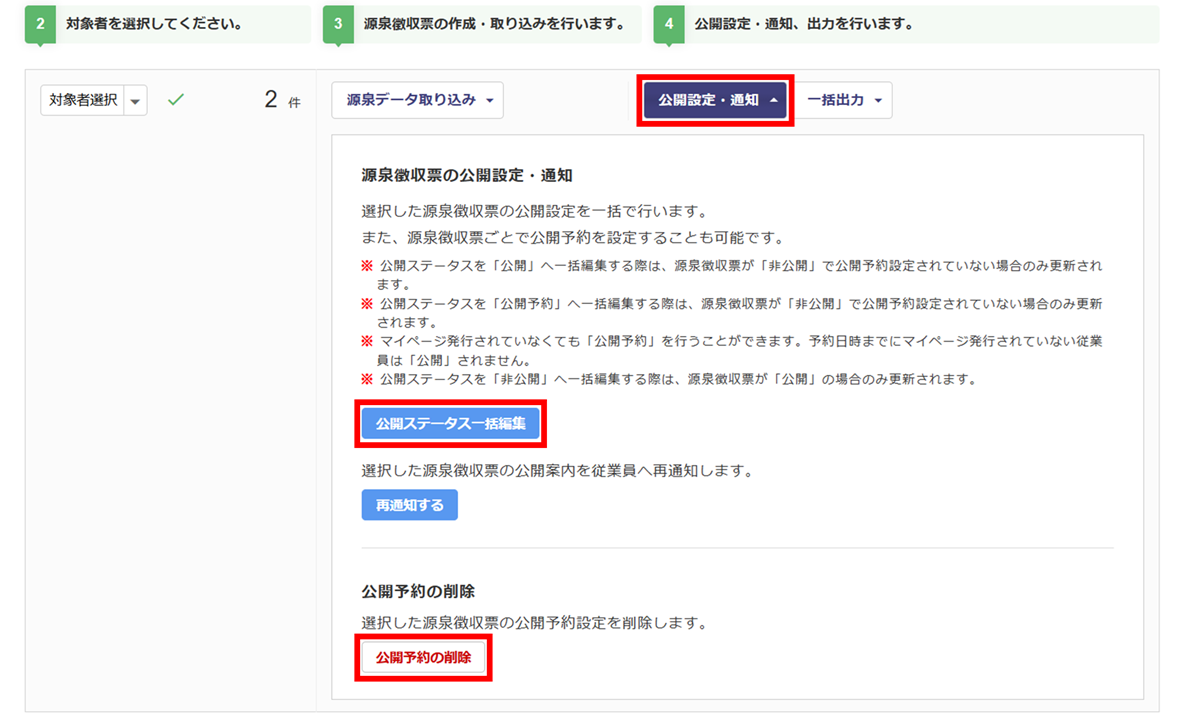 源泉徴収票が作成済み、かつ公開ステータスが「非公開」の従業員が、公開予約設定の対象となります。