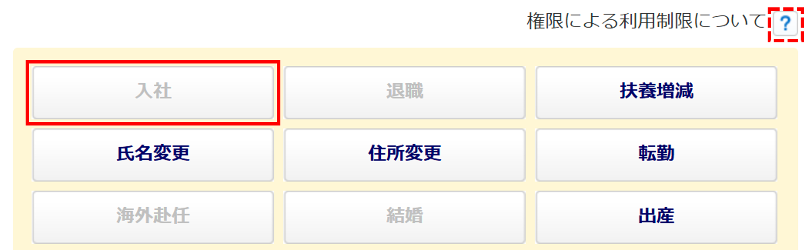 利用者の「給与情報の取り扱い」が「不可」となっている場合、「申請依頼」画面の[入社]ボタンがグレーアウトし、申請をおこなうことができません。[マスタ管理]>[利用者管理]をご確認ください。