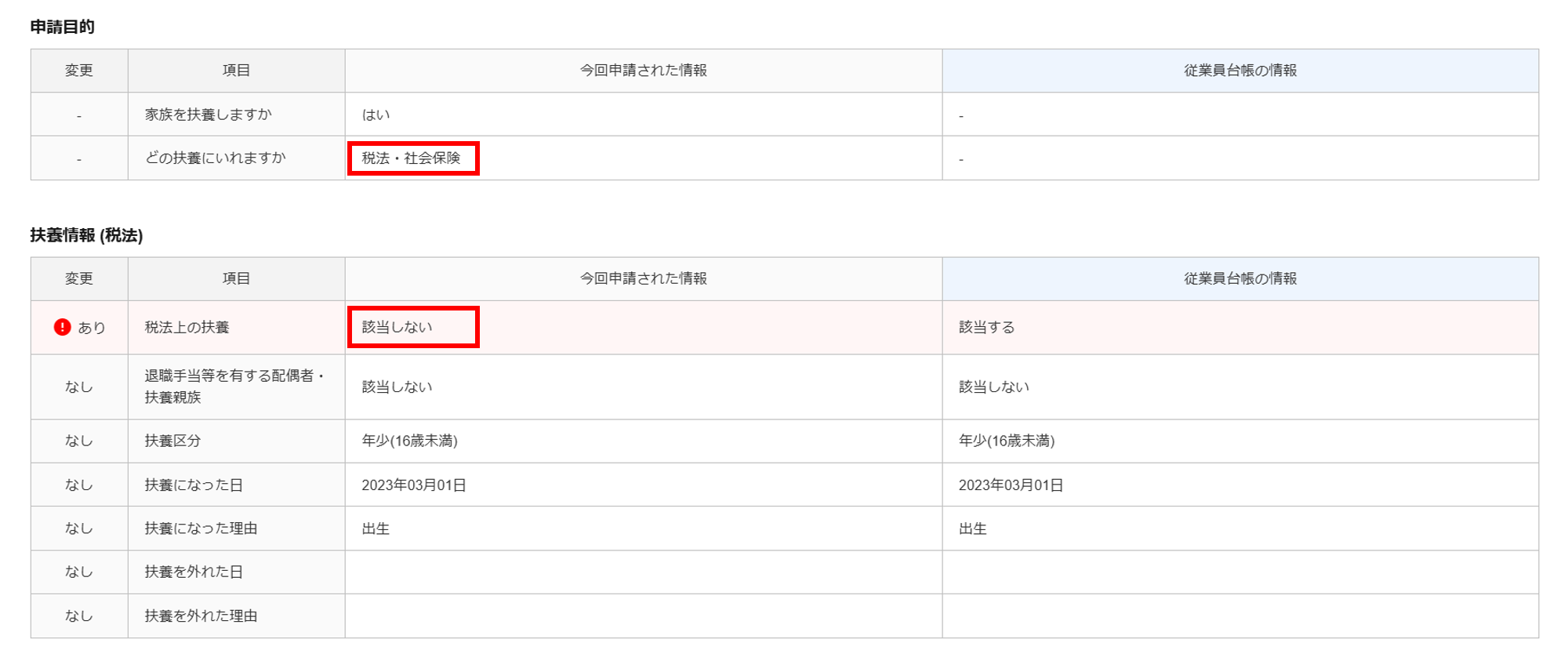《扶養家族の変更タスク時の「扶養区分」「税法上の扶養」項目設定を改修》