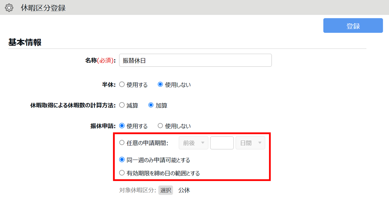 | 同一週のみ申請可能とする | 同一週内での振休申請のみ許可されます。 ※週の範囲は、[雇用区分設定]>「基本情報」カテゴリの[詳細]>「週の締め日」で選択した曜日に基づき決定されます。 |