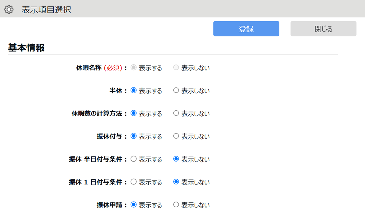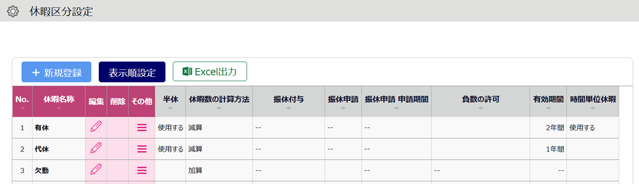 上記設定をおこなうことで、「休暇区分設定」画面に「表示する」と設定した項目が表示されます。
