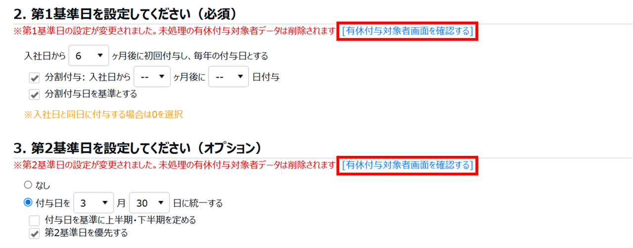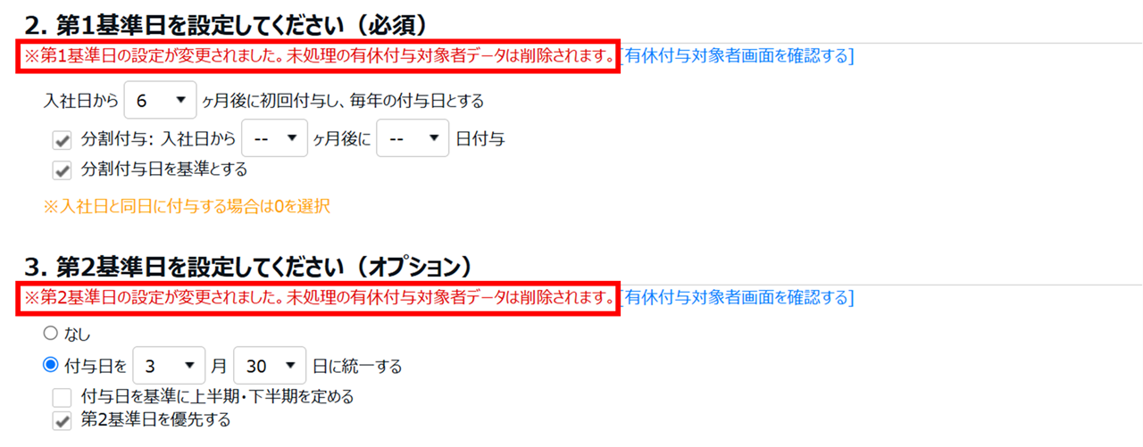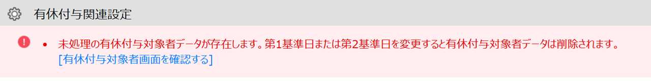○設定変更時に有休付与対象者データが削除される場合は、警告メッセージが画面上部に表示されるようになりました。