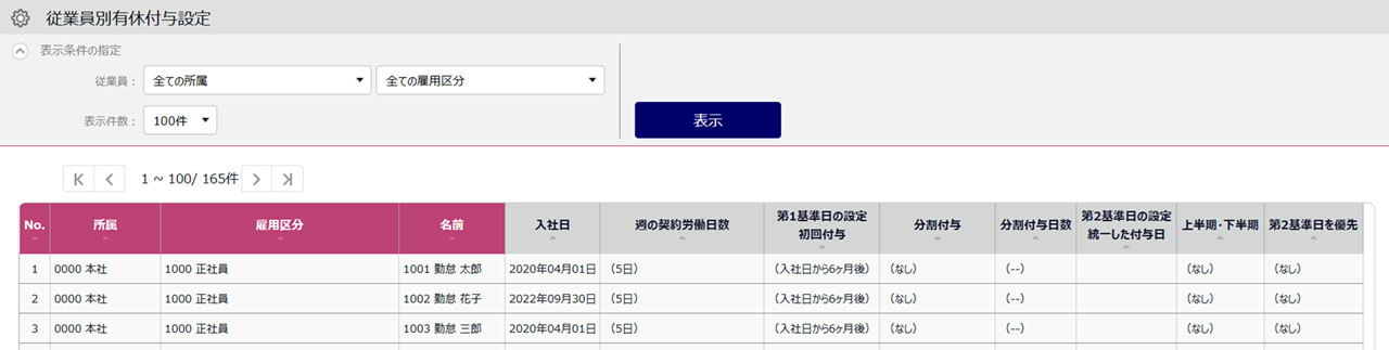 ○「有休付与設定」画面や「従業員別有休付与設定」画面において、表示項目を見直し、設定内容の表示が分かりやすくなりました。