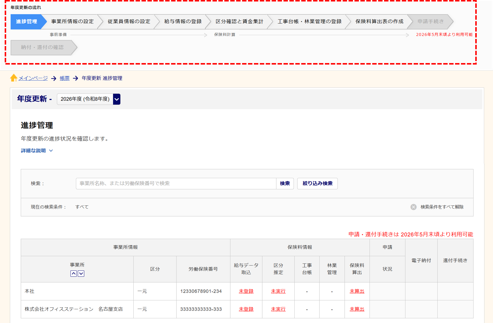 ・[年度更新の事前準備]を[年度更新 進捗状況]へ名称を変更しました。