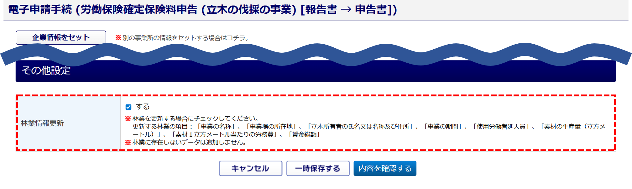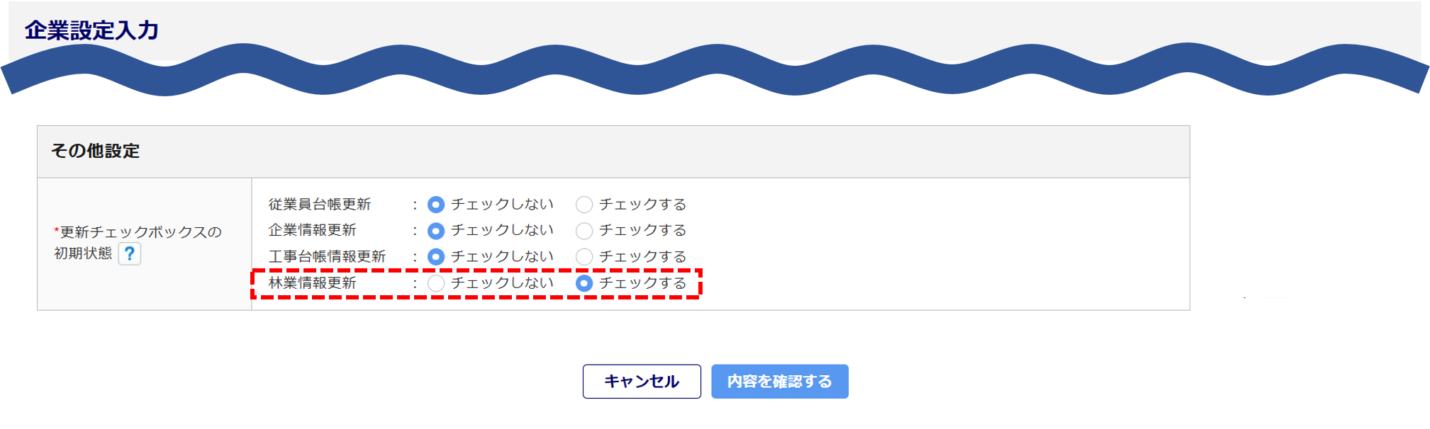 「チェックする」を選択している場合、対象帳票申請時に初期状態で「林業情報更新」にチェックが入ります。