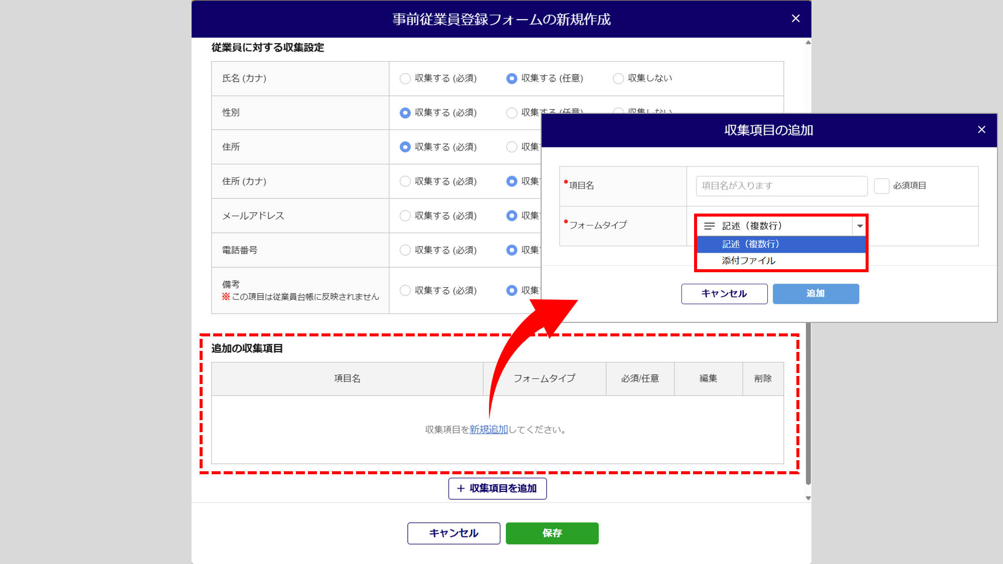 既存の収集項目のほかに、管理者側で収集項目を追加できるよう、「事前従業員登録フォームの新規作成」画面に、