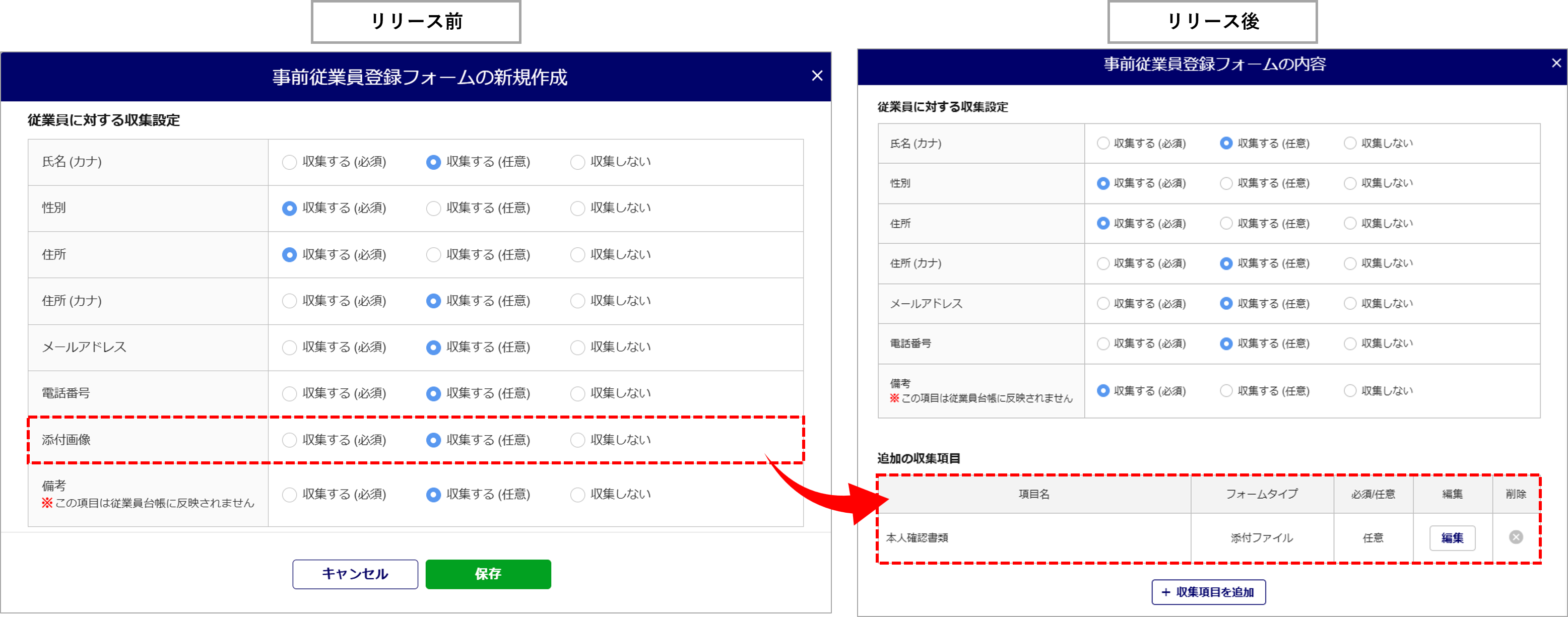 また、本リリースに伴い、「従業員に対する収集設定」カテゴリ内の「添付画像」項目を削除しました。