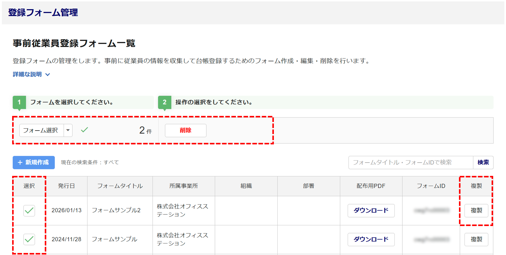 「登録フォーム管理」画面で、一括削除と複製ができるようになり、「エントリー管理」画面でも、一括削除ができるようになりました。