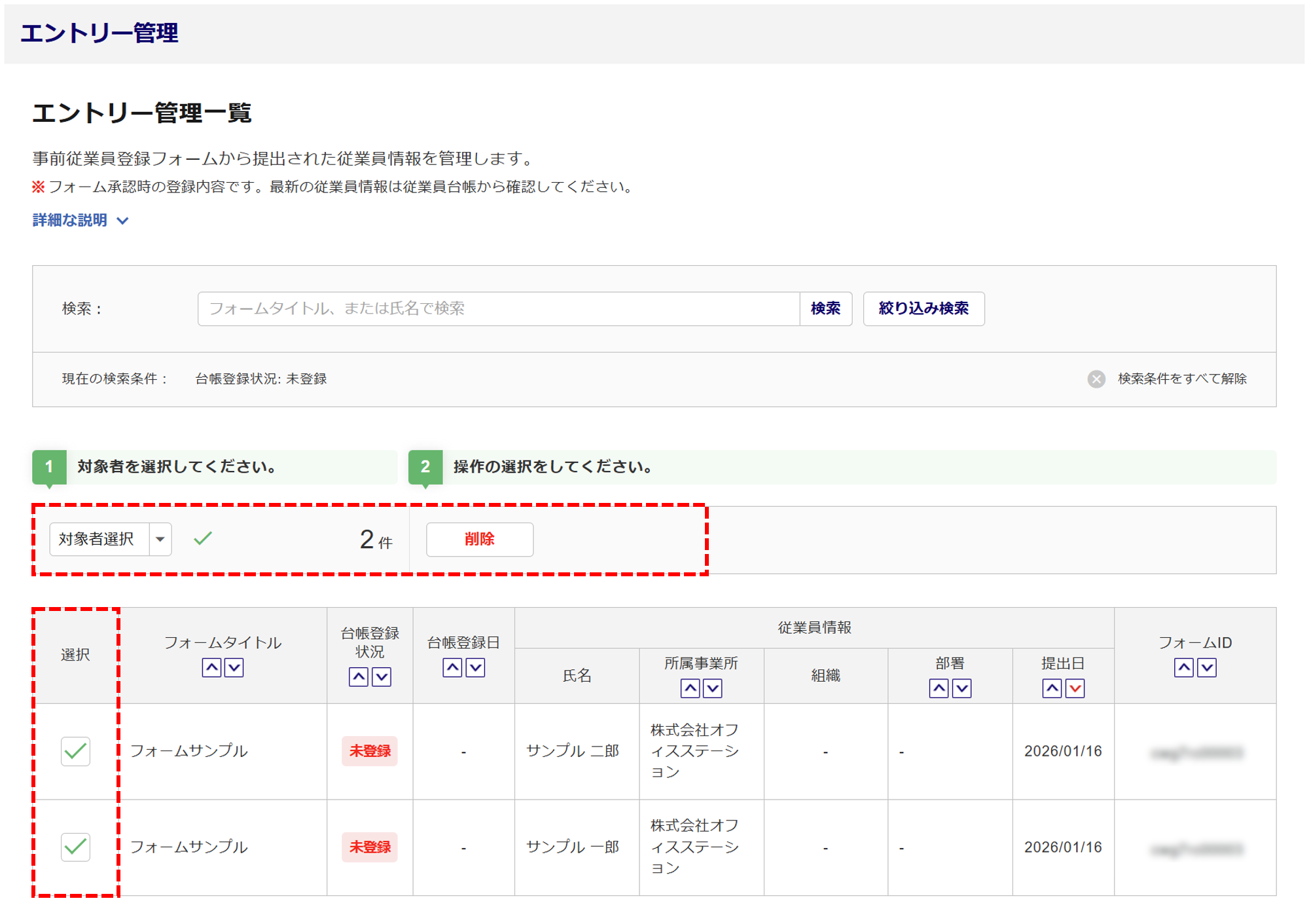※「エントリー管理」画面で一括削除できる上限数は、1,000件です。
