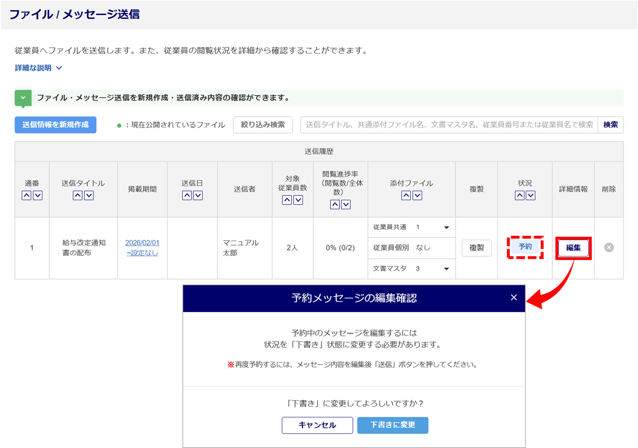 「予約」中の「ファイル/メッセージ」を編集する際は、ステータスを「下書き」に変更するように改修しました。