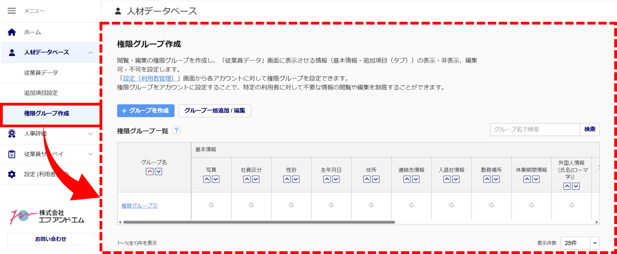 「権限グループ作成」では、「従業員詳細」画面に表示する情報の権限を設定します。