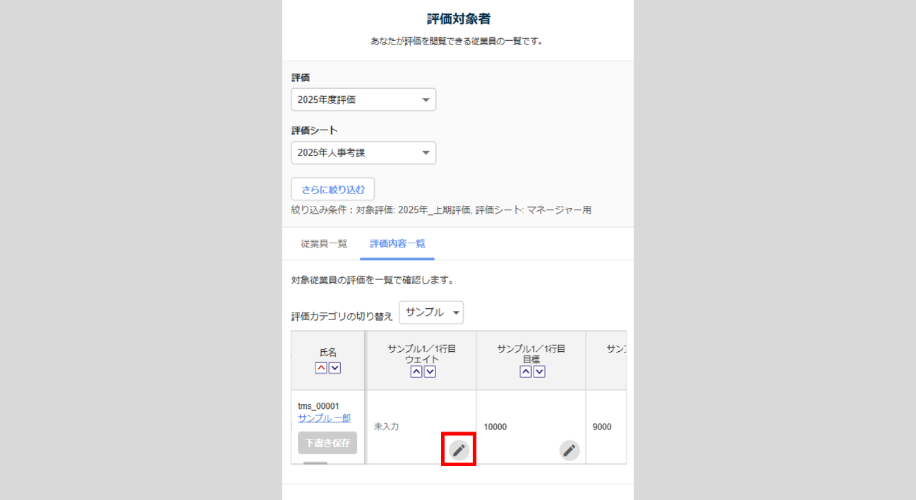 画面左上の[MENU]>[評価対象者]>[評価内容一覧]をクリックし、対象評価項目の[鉛筆マーク]から編集できます。