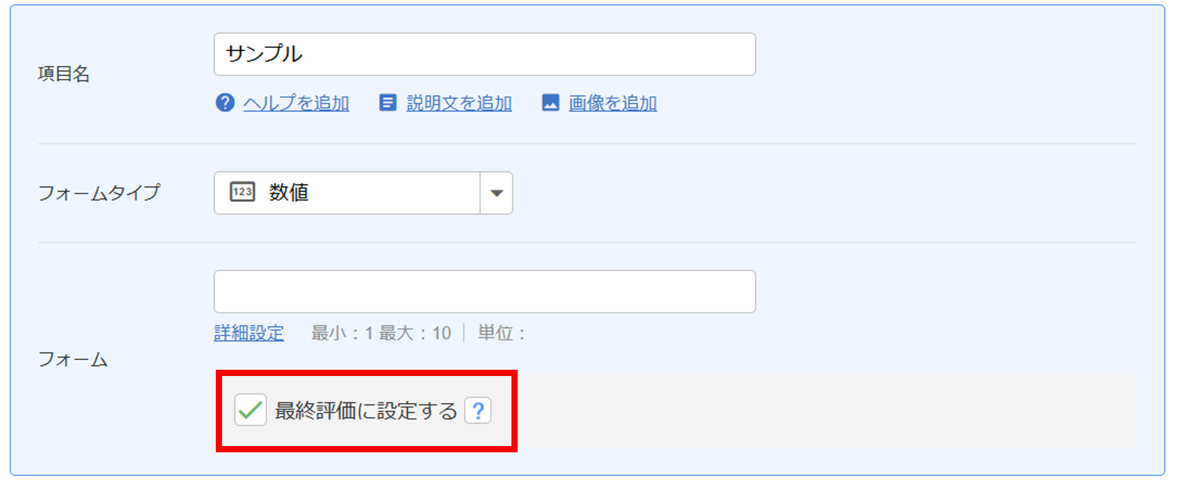 「評価シート」画面の「数値」「プルダウン」「計算結果」フォーム内に「最終評価に設定する」のチェックボックスを追加しました。