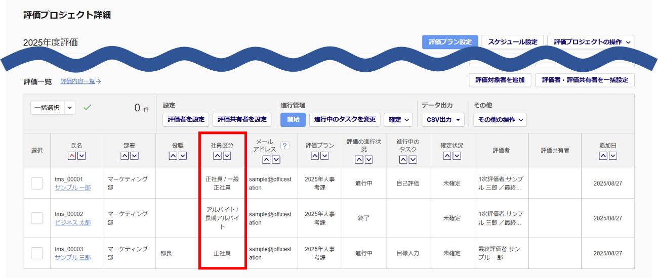「社員区分」列に「社員区分 / 社員区分詳細」で表示
