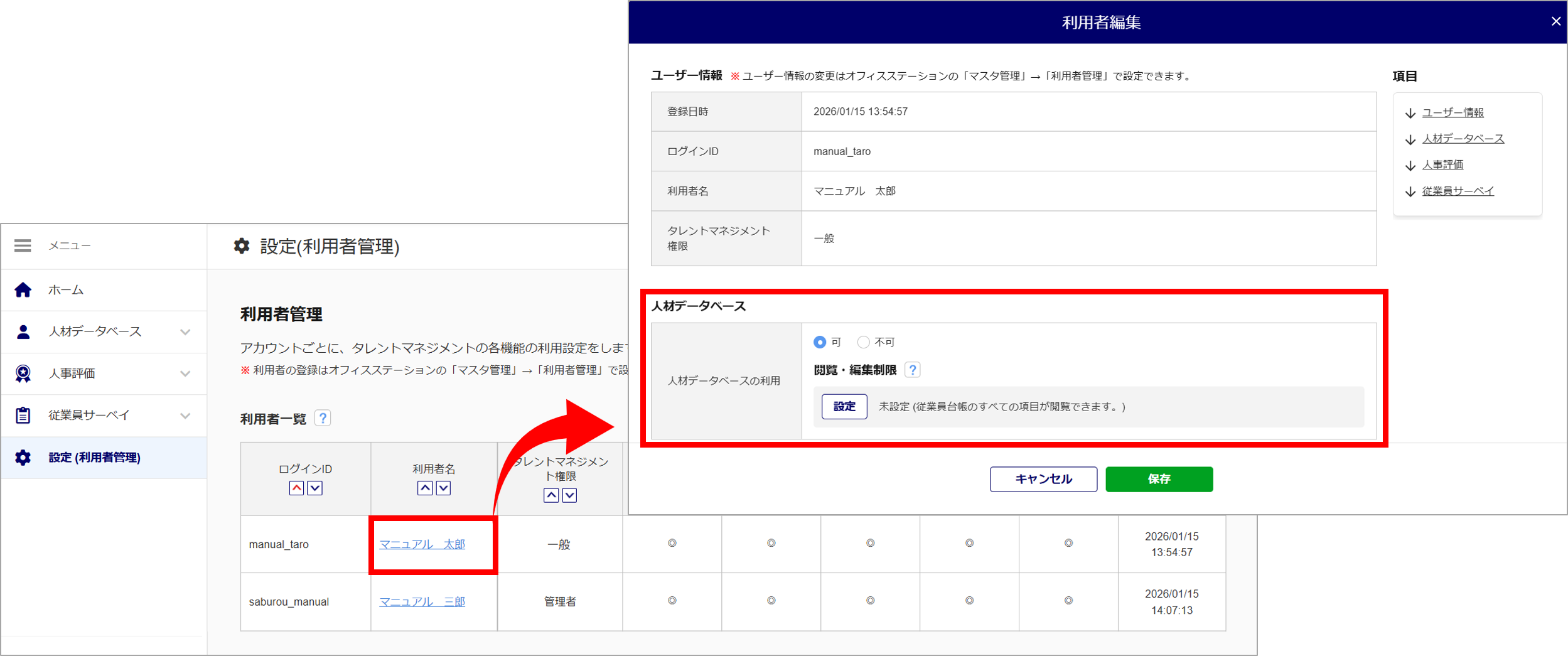 *オフィスステーション本体の[利用者管理]にて、タレントマネジメント権限が「一般」の利用者に限り表示されます。