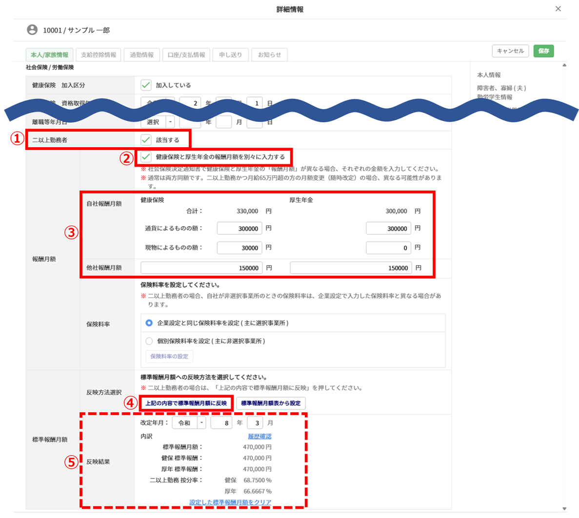 [上記の内容で標準報酬月額に反映](④)をクリックすると、「反映結果」項目(⑤)に、入力した結果が反映されます。