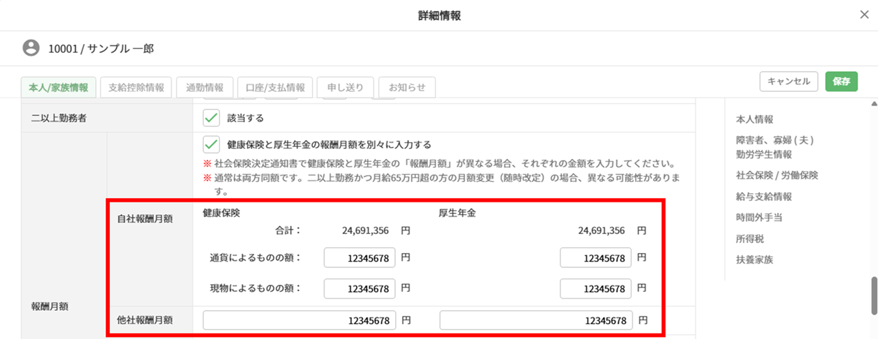 二以上勤務者の「報酬月額」項目を、健康保険と厚生年金それぞれ異なる金額で登録できるようになりました。また、「二以上勤務 按分率」についても、それぞれ個別に計算されます。