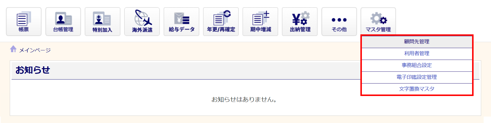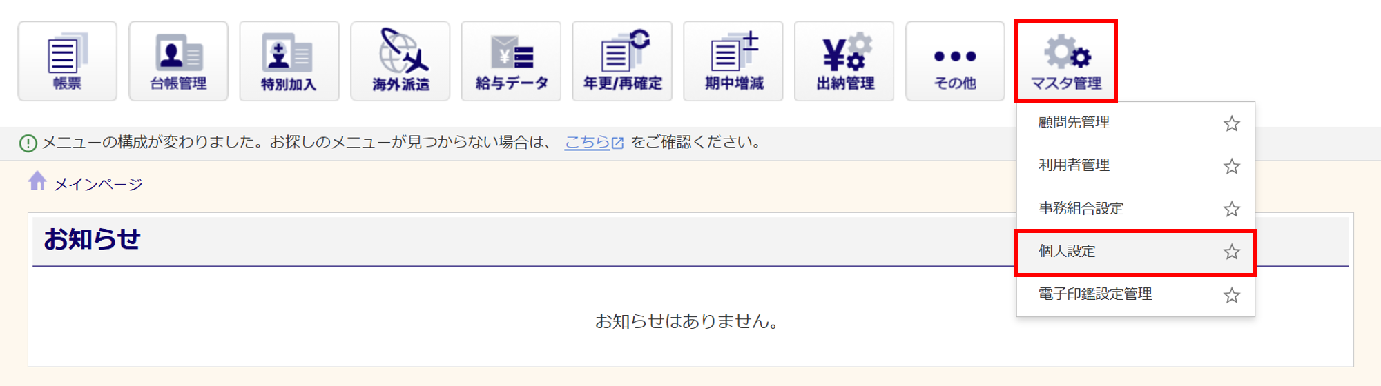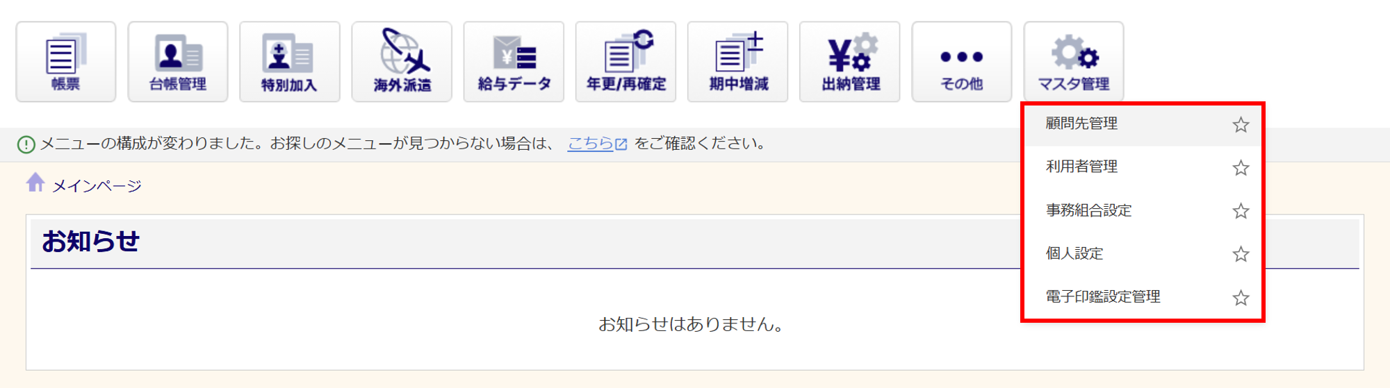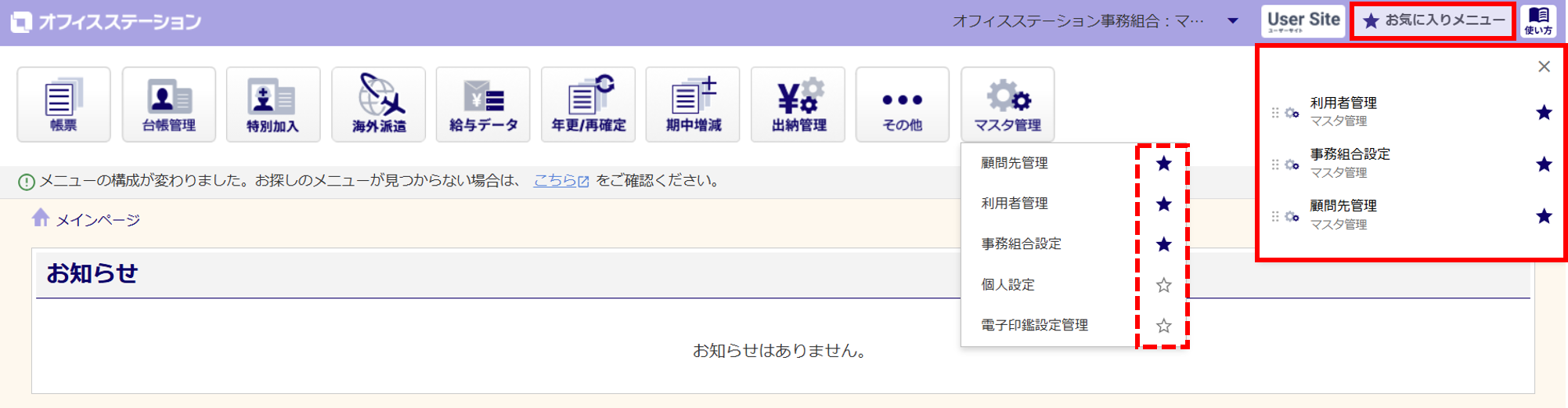 利用頻度の高いメニューを即座に操作できるよう、各サブメニューに[☆(星マーク)]を追加し、お気に入り登録できるようになりました。[☆(星マーク)]をクリックすると、[お気に入りメニュー]に登録されます。