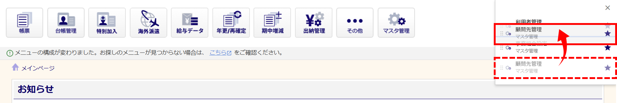 お気に入り登録したメニューは、ドラッグアンドドロップで順番を変更できます。