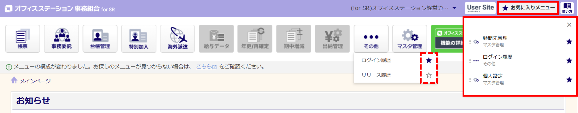 利用頻度の高いメニューを即座に操作できるよう、各サブメニューに[☆(星マーク)]を追加し、お気に入り登録できるようになりました。