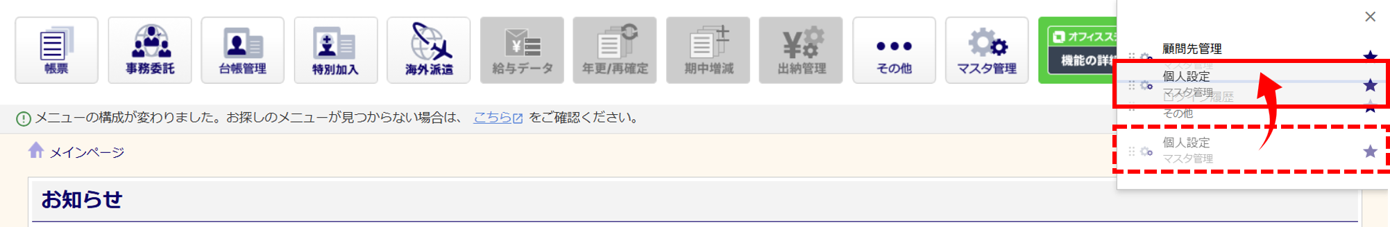お気に入り登録したメニューは、ドラッグアンドドロップで順番を変更できます。