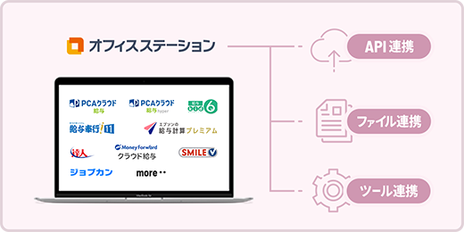 他社システム連携 : API連携/ファイル連携/専用ツール連携 ※「オフィスステーション 勤怠」のみ他社システムとの連携に対応しておりません。