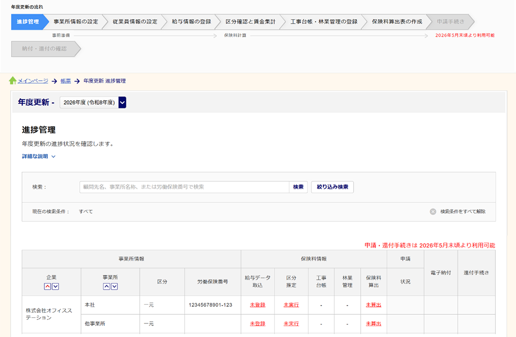 「年度更新 進捗管理」画面を新設し、事業所ごとに進捗状況の管理ができるようになりました。