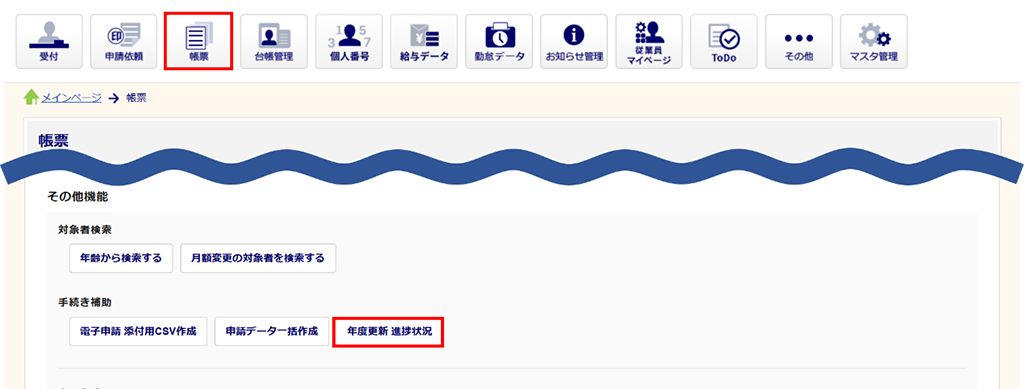 [帳票]>[年度更新 進捗状況]をクリックします。