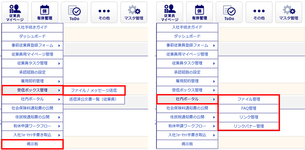 ※「オフィスステーション 労務」をアカウント発行している場合は、「受信ボックス」および「掲示版」は既存機能となります。