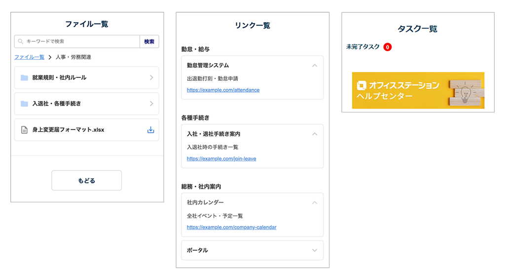 左から、ファイル一覧、リンク一覧、リンクバナー