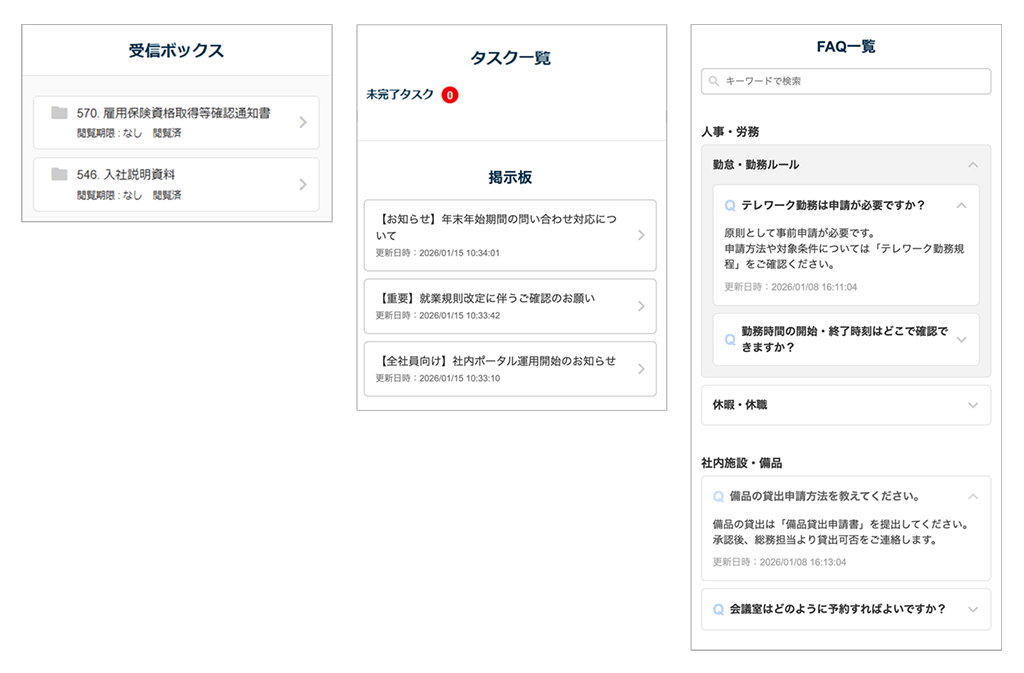 左から、受信ボックス、掲示板、FAQ一覧