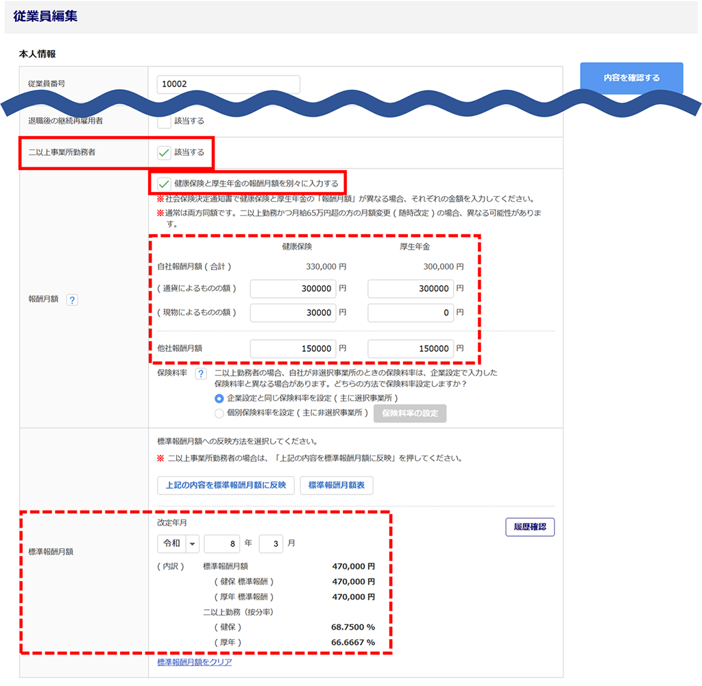二以上事業所勤務者の「報酬月額」項目に、健康保険と厚生年金を異なる金額で登録できるようになりました。