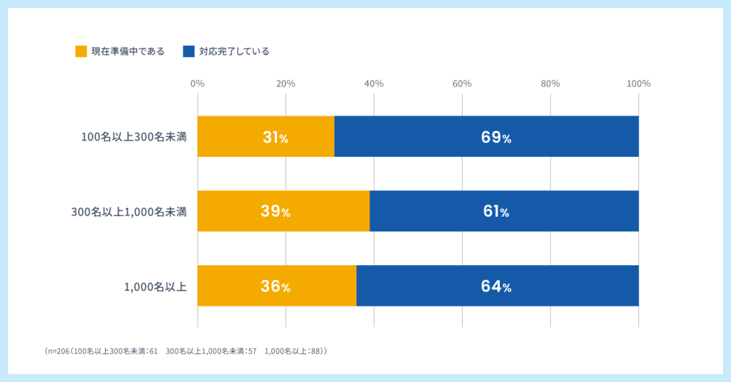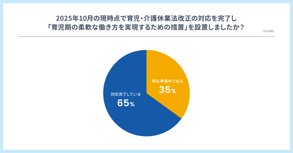 2025年10月時点で、育児・介護休業法改正への対応を「完了している」と回答した企業は65%にとどまり、35%は「現在準備中」と回答しました。