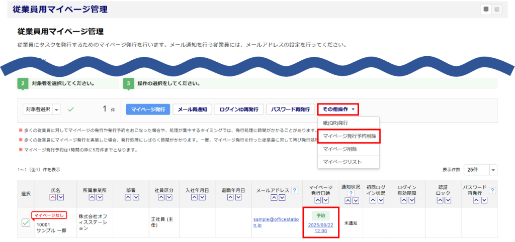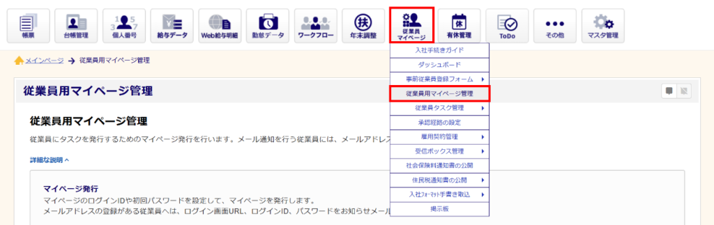 [従業員マイページ]>[従業員用マイページ管理]からマイページ発行をおこないます。